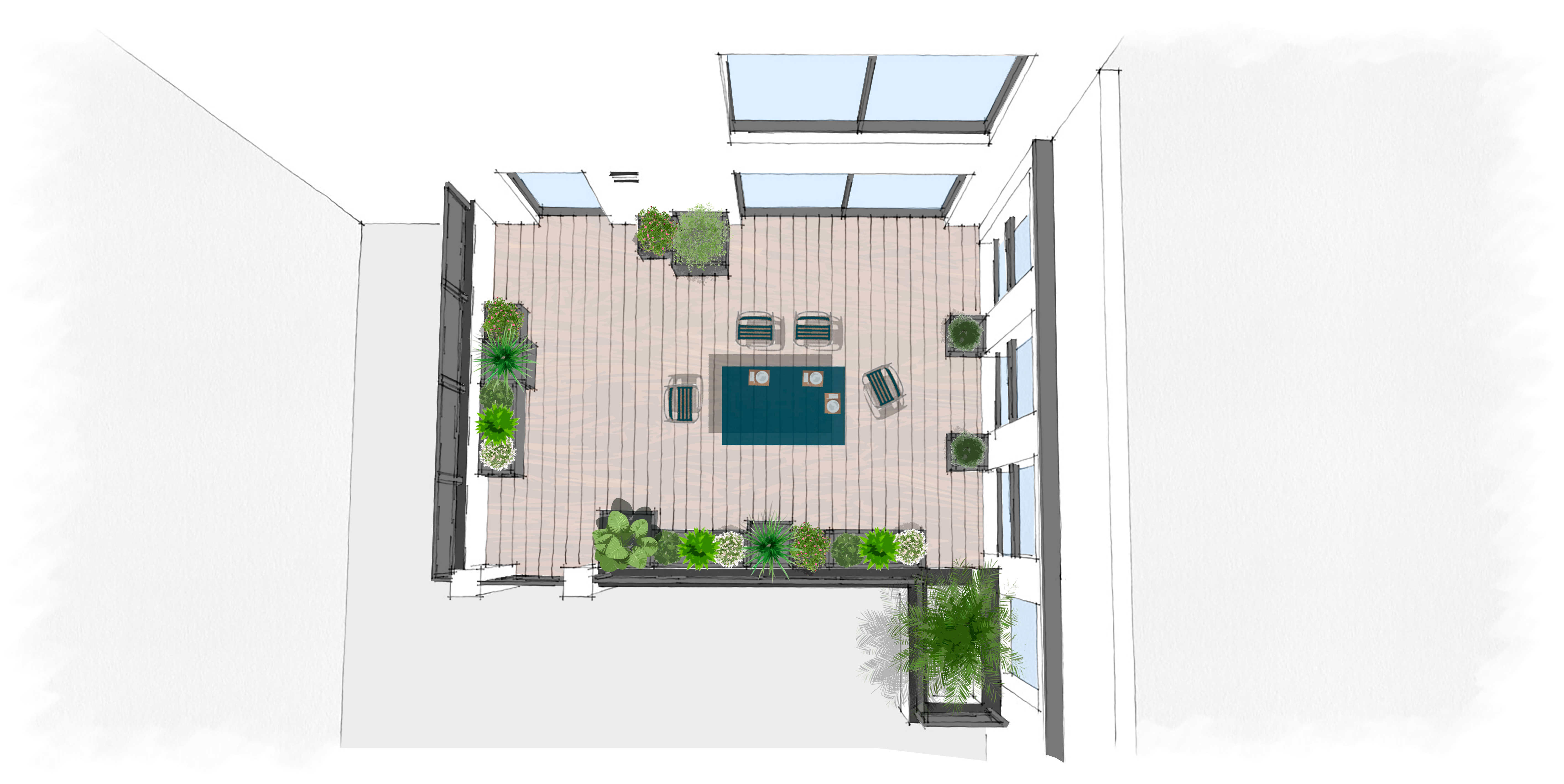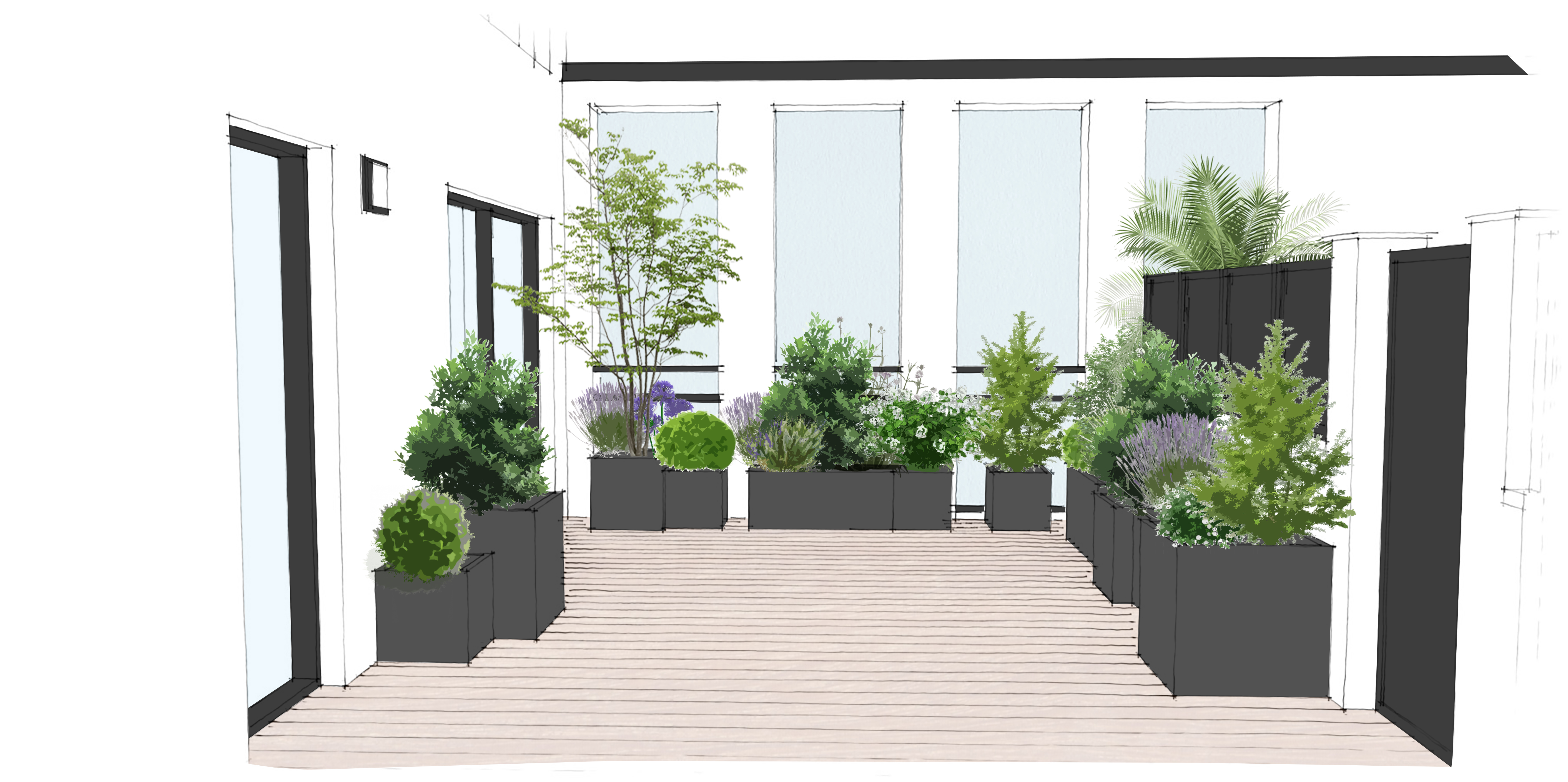 Apporter de la verdure à cette terrasse déjà marquée par une architecture industrielle très présente. Pour réaliser cet aménagement nous avons privilégié des bacs sobres noirs de grande qualité (fiberstone) de différentes tailles et disposés de façon à créer du rythme sans trop en faire. Les végétaux viennent jouer avec les volumes et ponctuer les ouvertures afin de dialoguer avec le lieu sans effacer sa singularité.