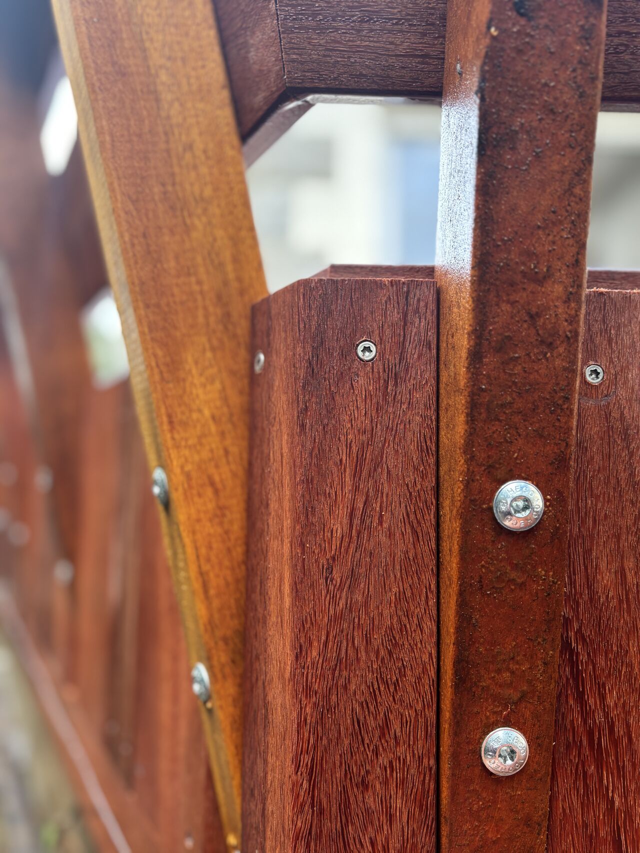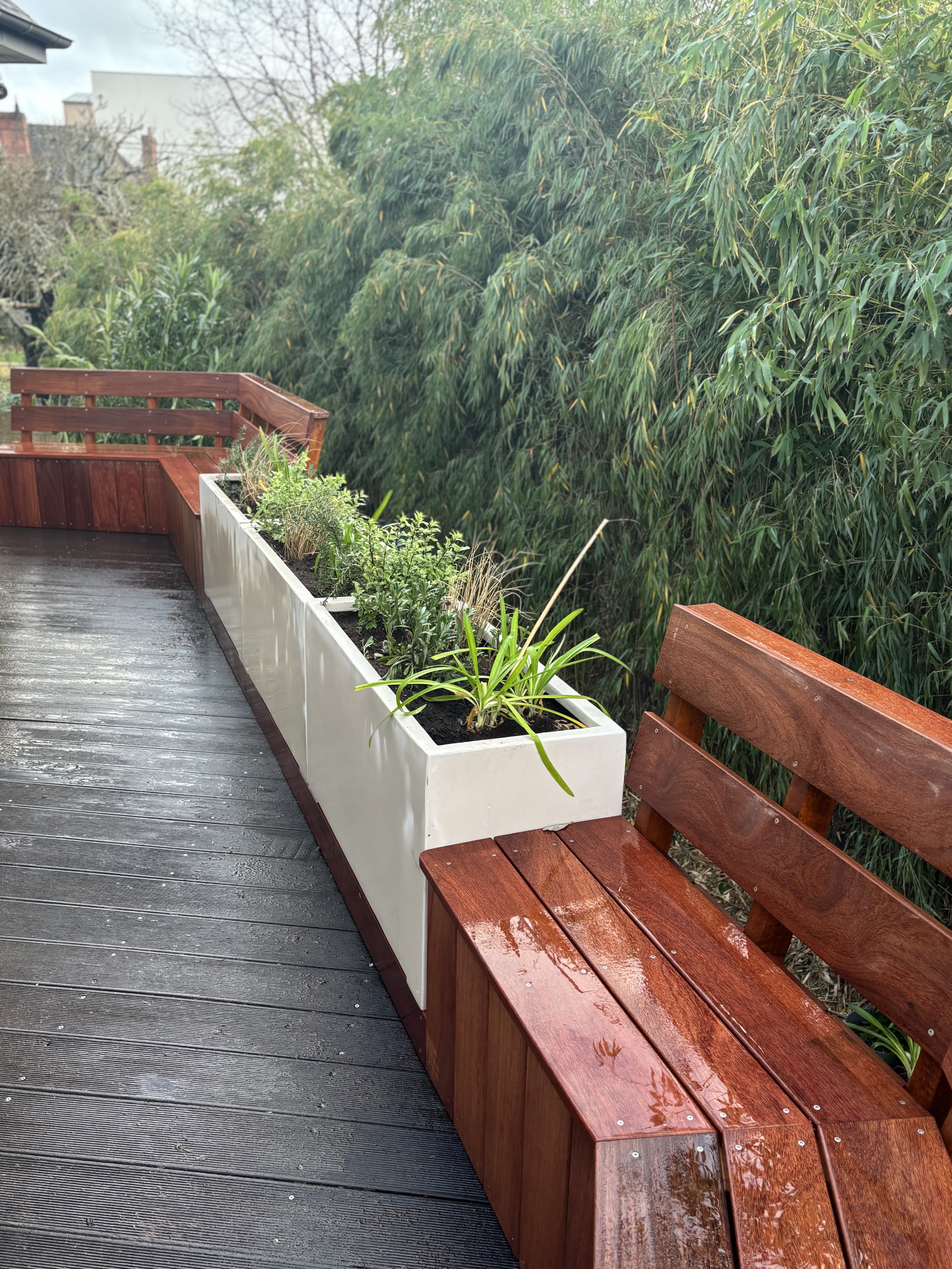 – Réaménagement des banquettes avec un habillage en bois exotique Cumaru, choisi pour sa robustesse et son esthétique.