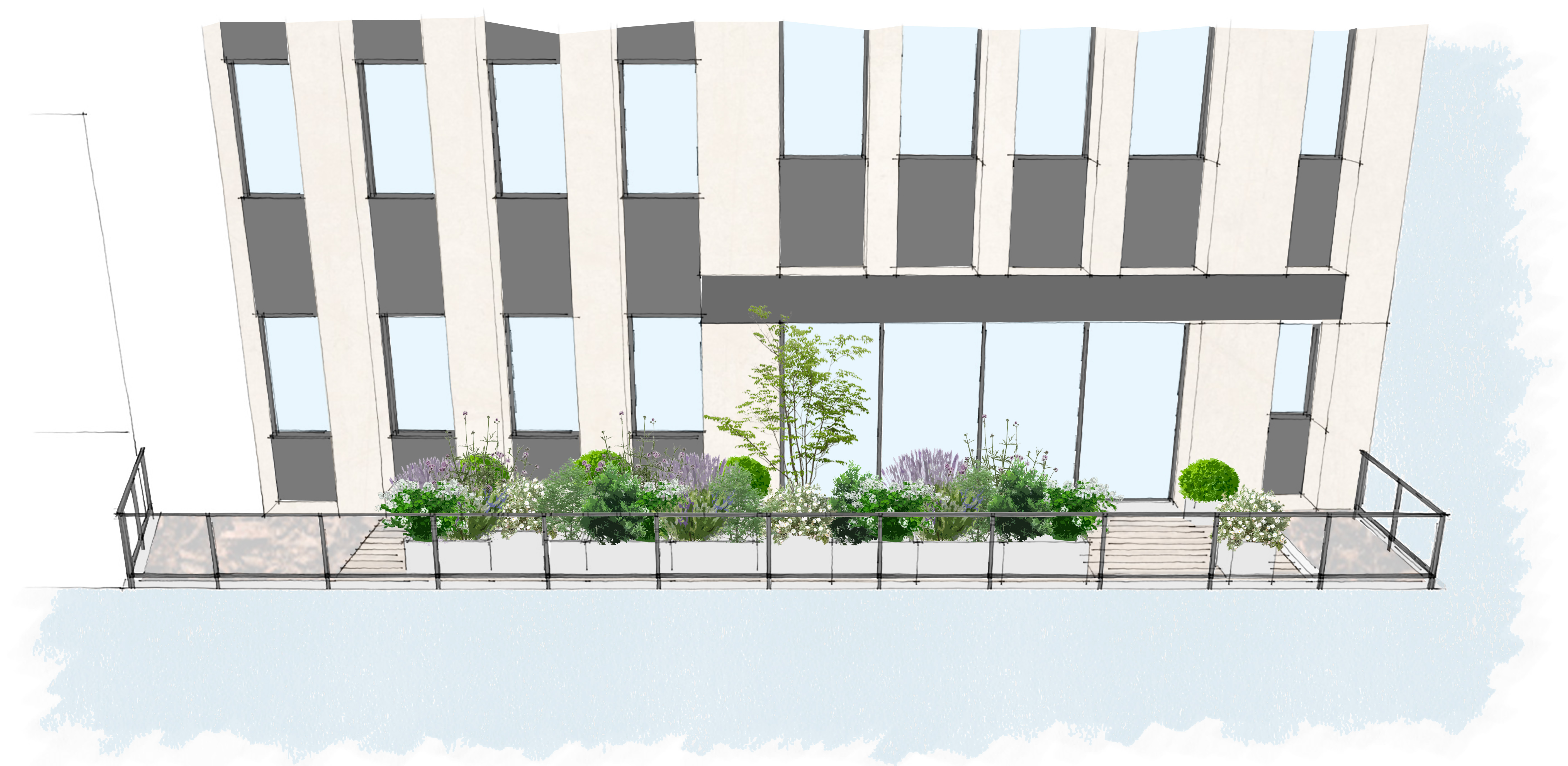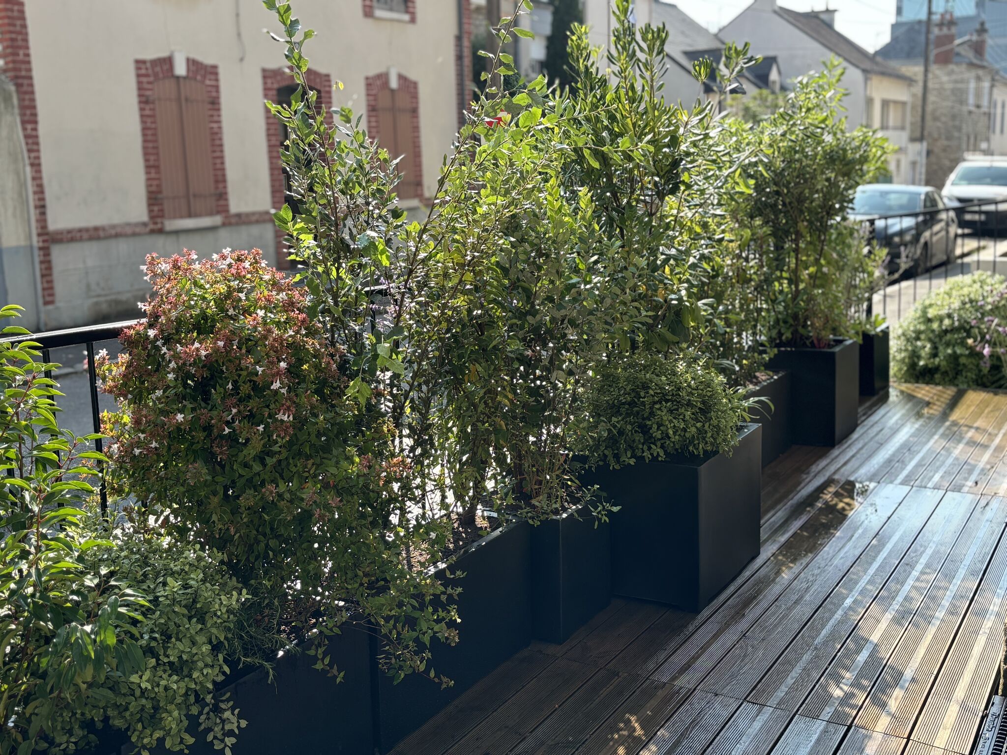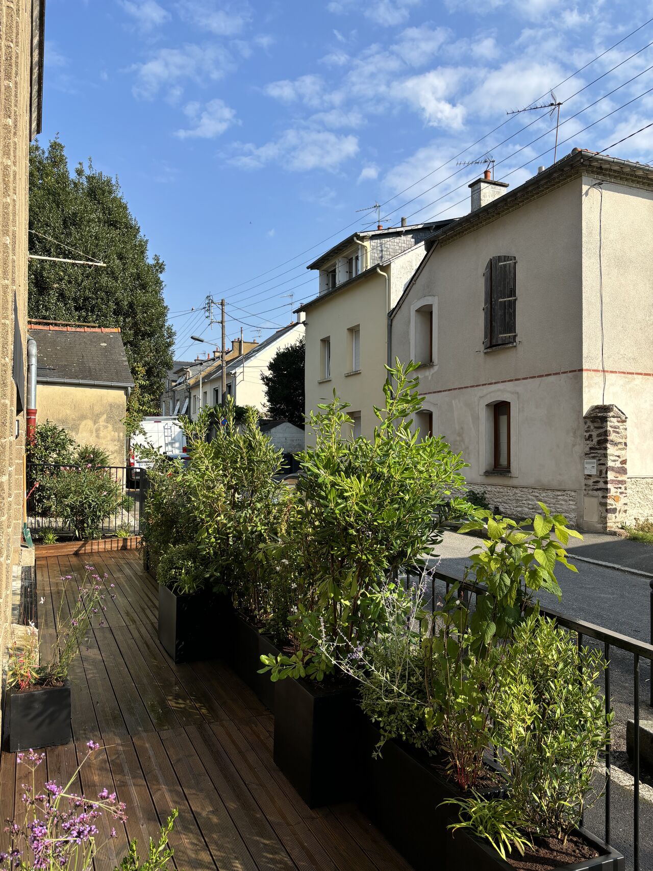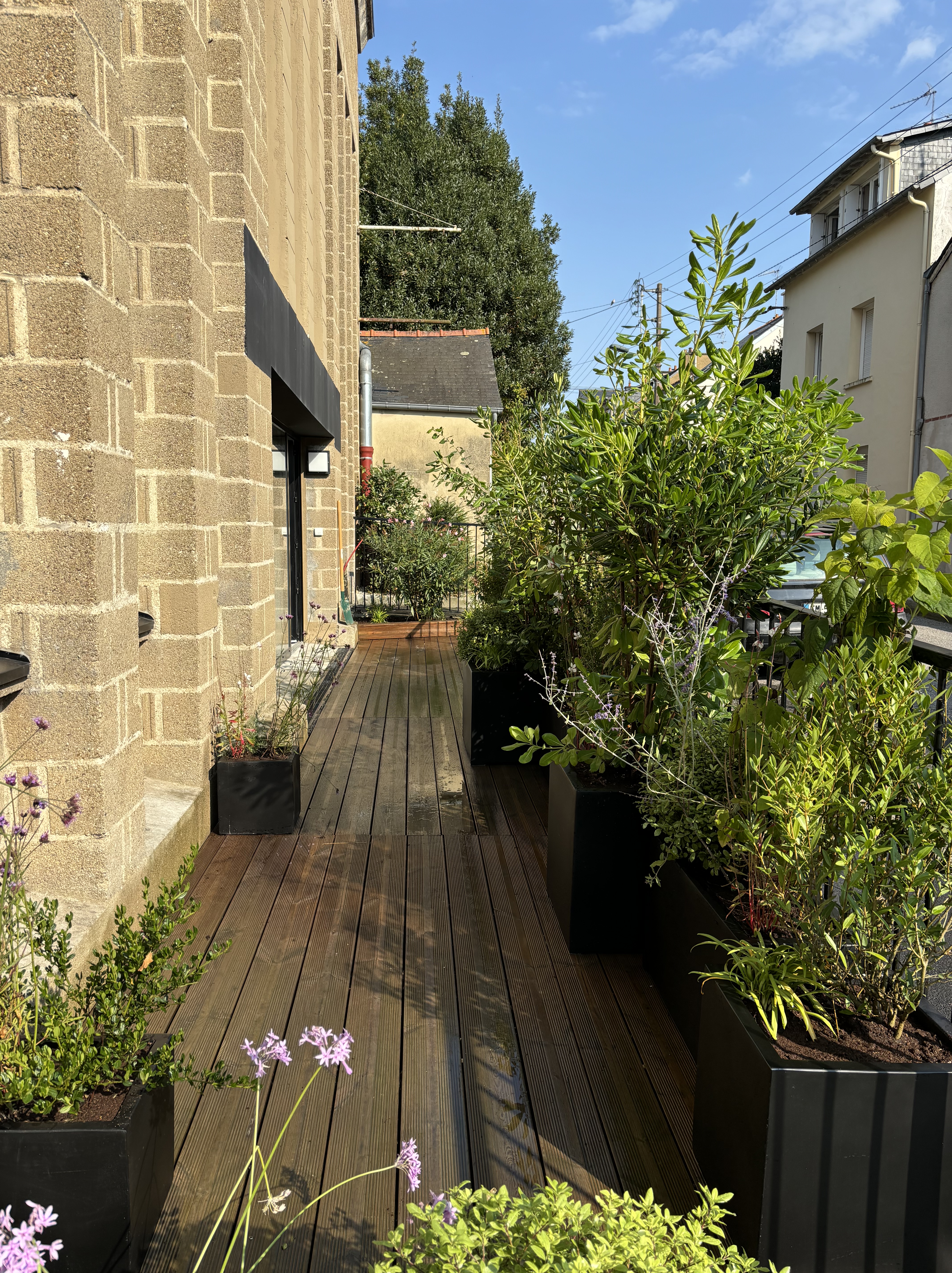 Création d’une terrasse en rez-de-chaussée réalisée en centre-ville de Rennes, écrin de verdure protégé de la ville composé de divers éléments :