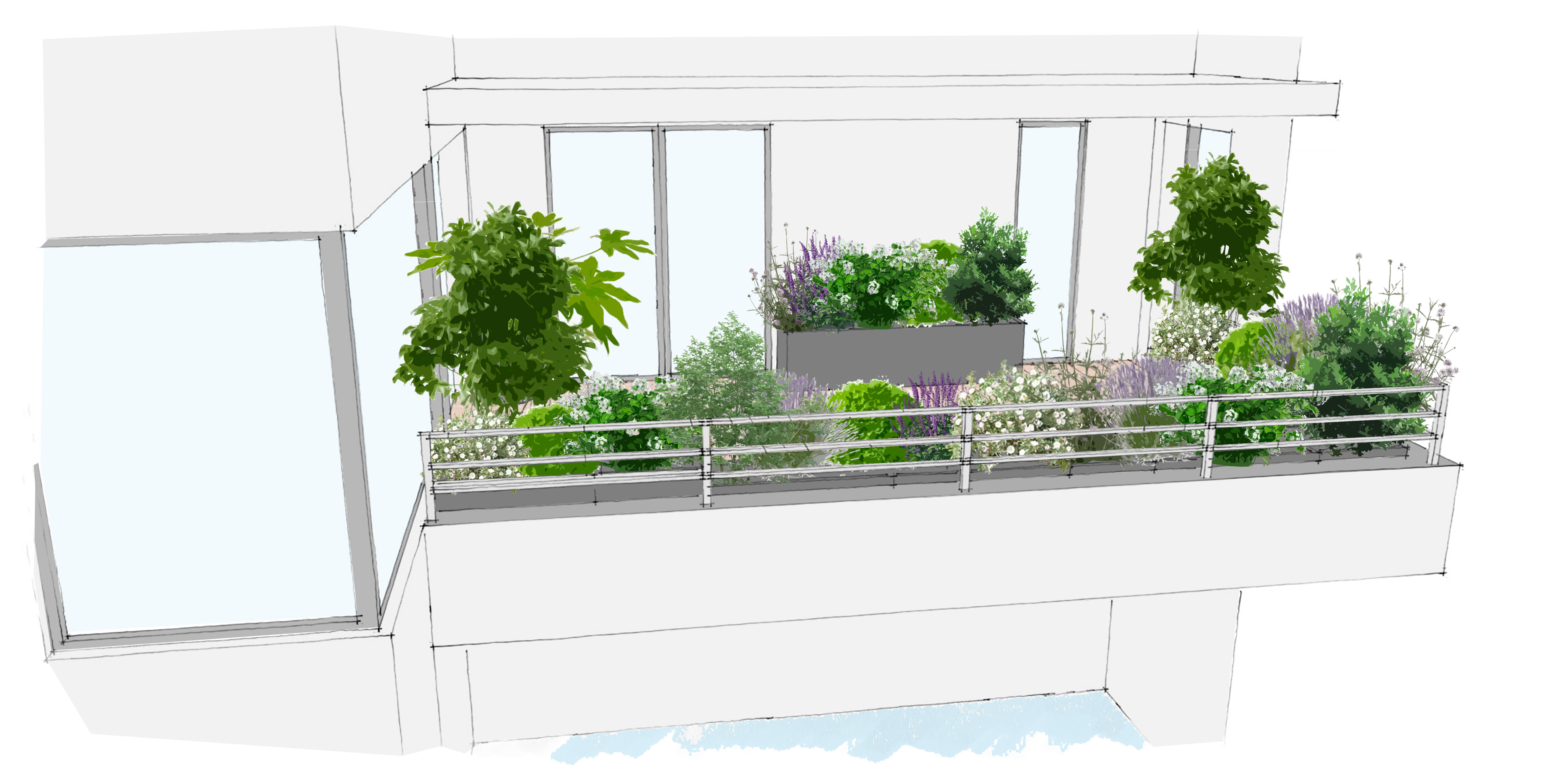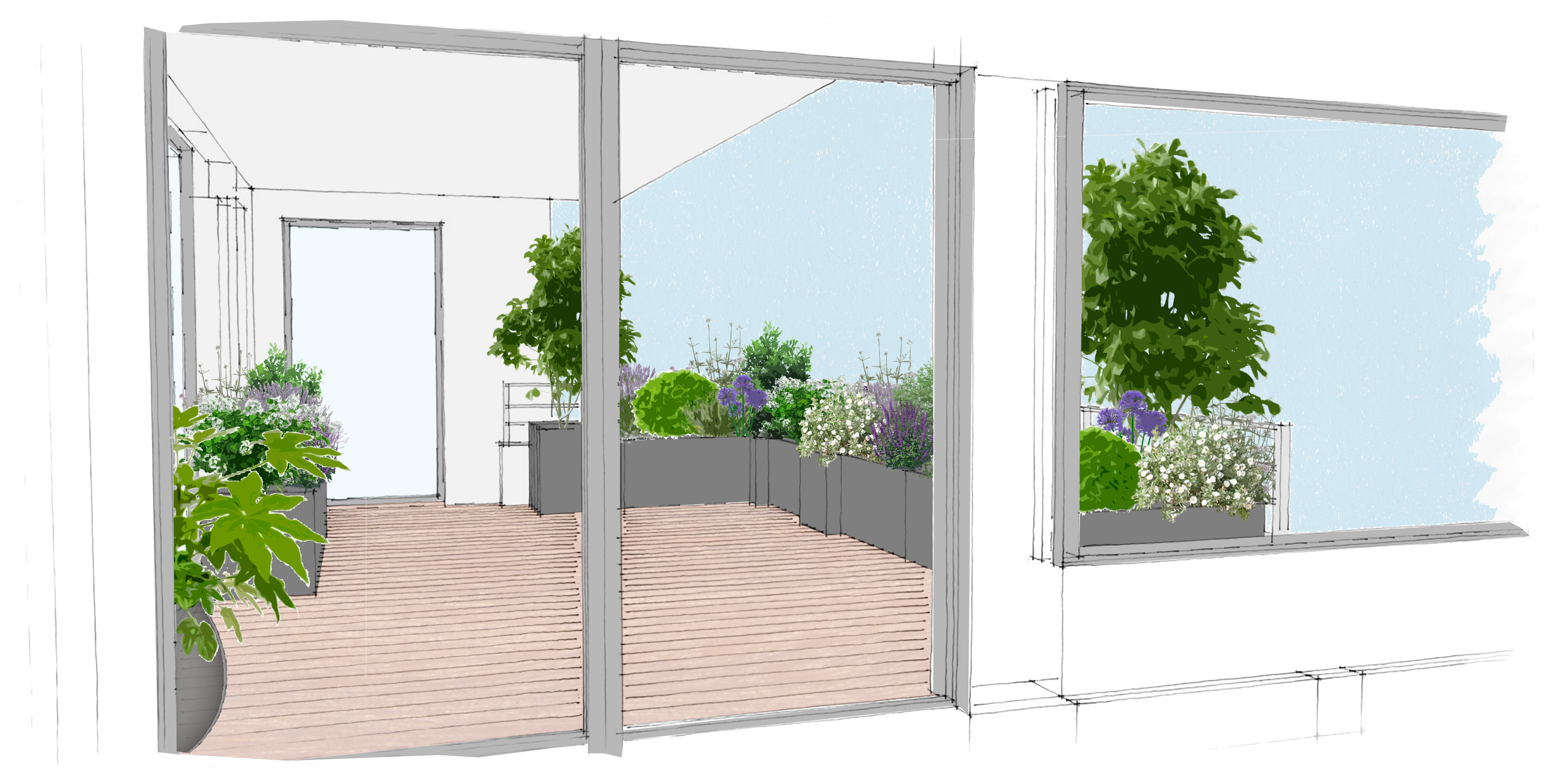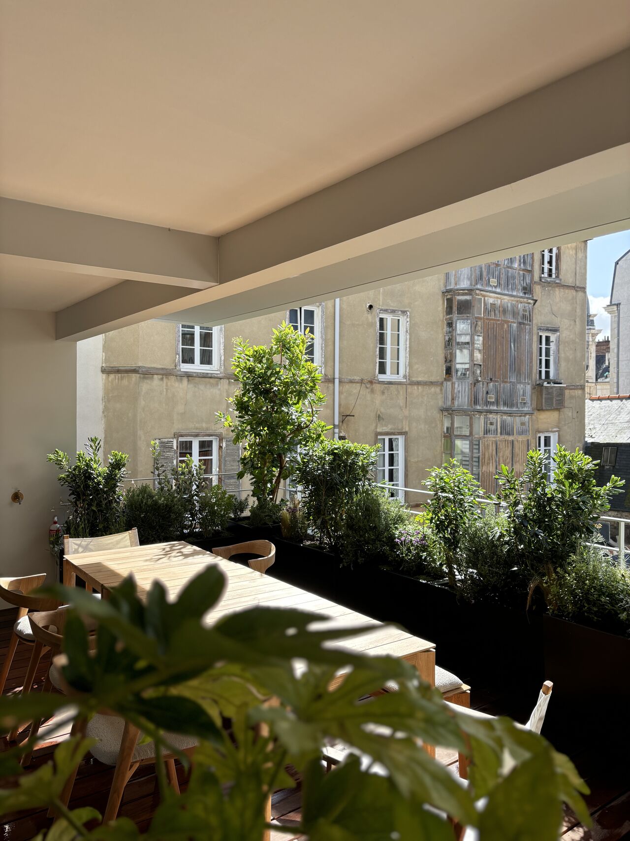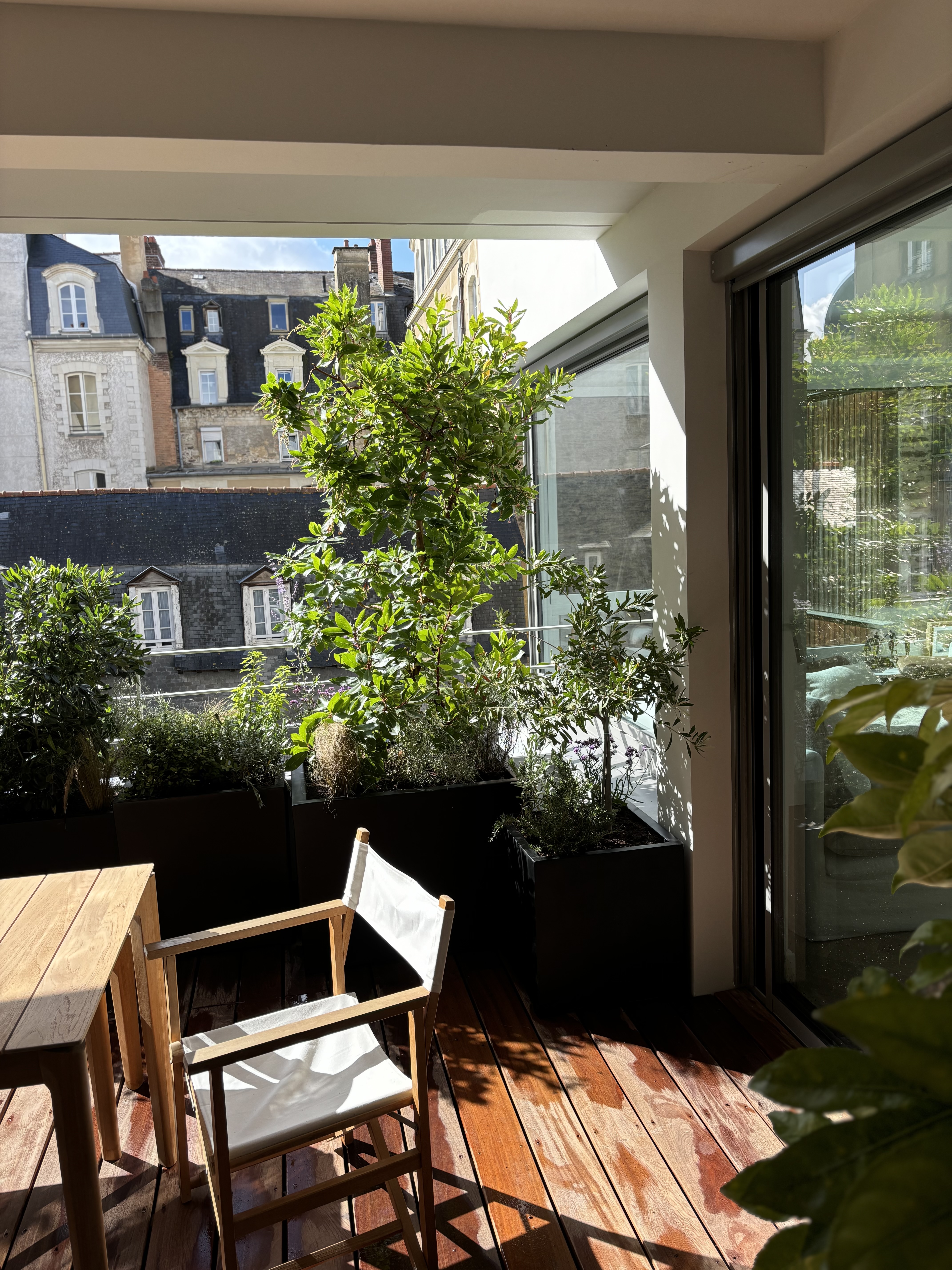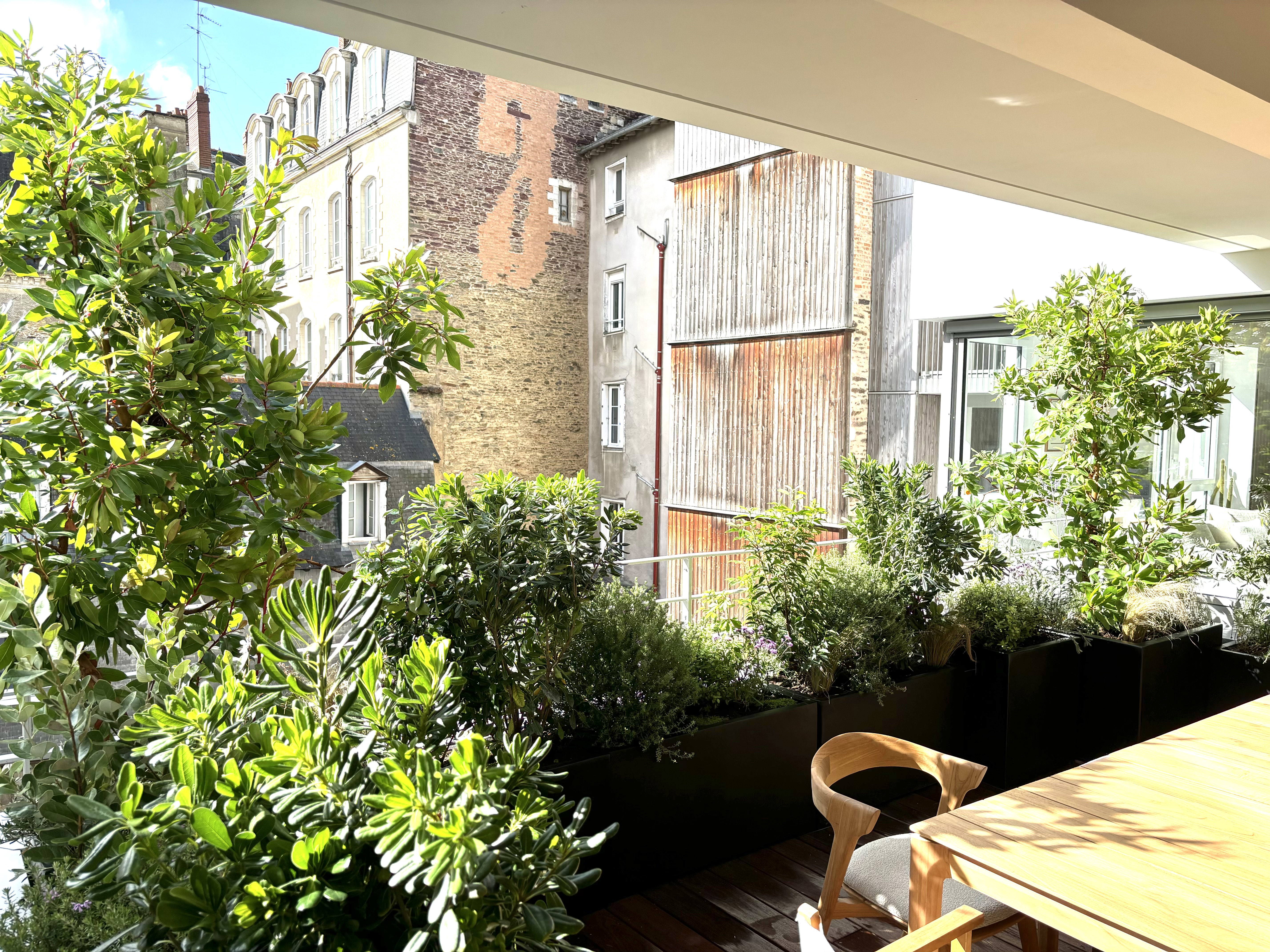 Terrasse réalisée en centre-ville de Rennes, écrin de verdure suspendu composé de divers éléments :