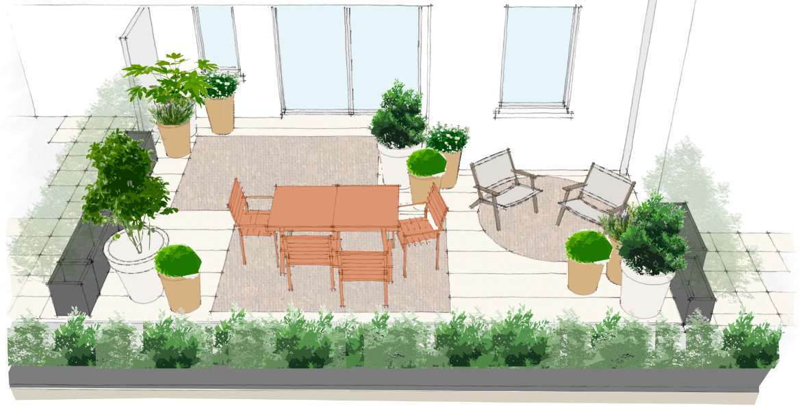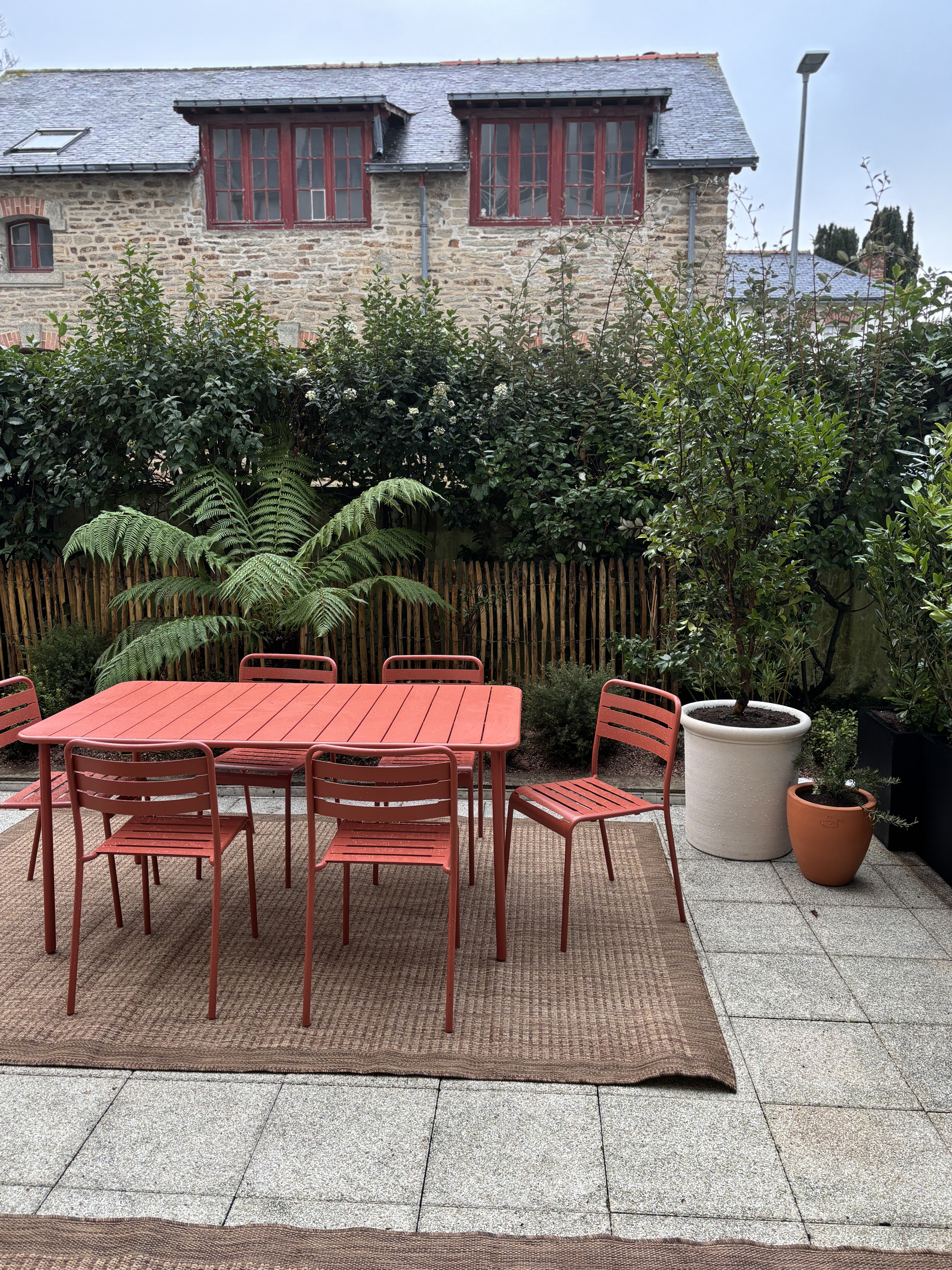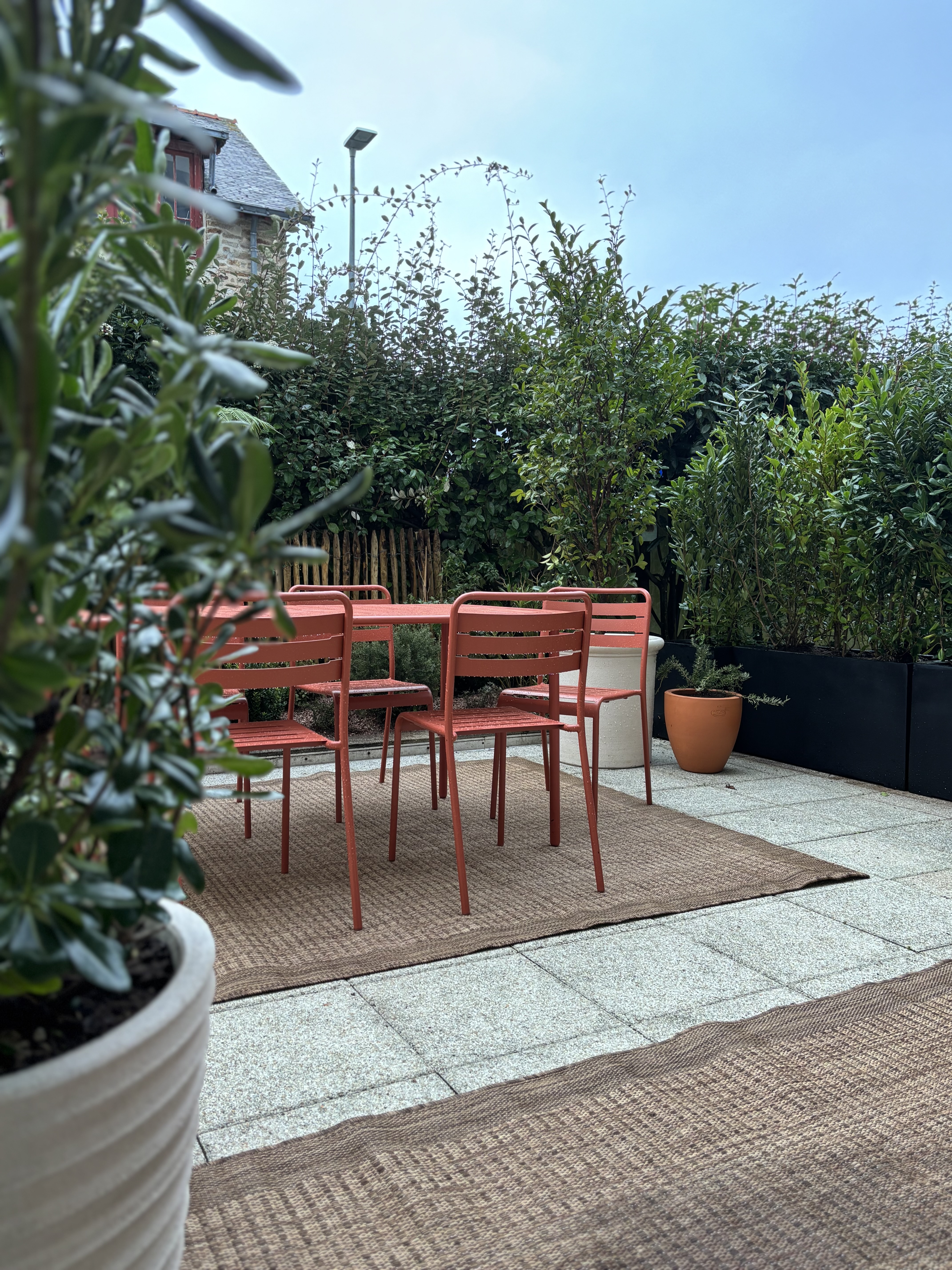 Réaménagement complet d’une terrasse urbaine à Vannes. L’objectif ? Transformer cet espace en un véritable cocon végétal, à la fois cosy et fonctionnel :